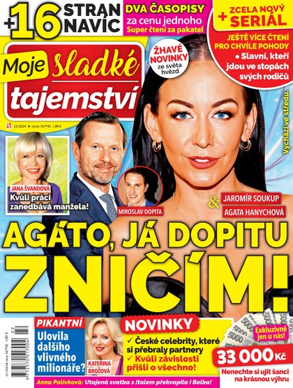 Časopis Moje sladké tajemství 22/2024 nabízí rozmanitou směs příběhů, drbů, rad a inspirace, která potěší každého čtenáře. Od dramatických osudů hvězd po praktické tipy pro domácnost, krásu a vztahy – toto vydání je ideálním společníkem pro chvilky klidu a odpočinku.